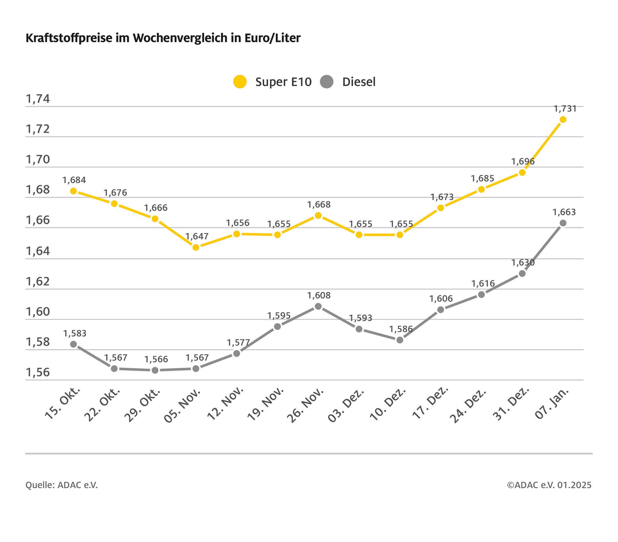 Der Preis der CO2-Abgabe ist zum Jahreswechsel von 45 Euro auf mittlerweile 55 Euro pro ausgestoßener Tonne Kohlendioxid gestiegen. Damit hat sich nach Berechnungen des ADAC sowohl für Benzin als auch für Diesel der Anteil der CO2-Abgabe um weitere etwa drei Cent je Liter erhöht. Hinzu kommt, dass auch Rohöl in den vergangenen beiden Wochen wieder teurer geworden ist: Ein Barrel der Sorte Brent kostet derzeit über 77 US-Dollar nach einem Preis von knapp unter 75 Dollar vor einer Woche. Seit Weihnachten bedeutet dies einen Preisanstieg um rund 5 Prozent, der sich auch an den Zapfsäulen durch höhere Kraftstoffpreise zeigt.