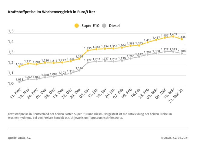 München (ots) Erstmals seit Anfang Dezember 2020 ist der Benzinpreis im Vergleich zur Vorwoche gesunken. Das zeigt die aktuelle ADAC Auswertung der Kraftstoffpreise in Deutschland. Für einen Liter Super E10 müssen die Autofahrer im bundesweiten Mittel derzeit 1,445 Euro bezahlen, das sind 2,4 Cent weniger als vor einer Woche. Im selben Zeitraum ist auch Diesel-Kraftstoff billiger…
