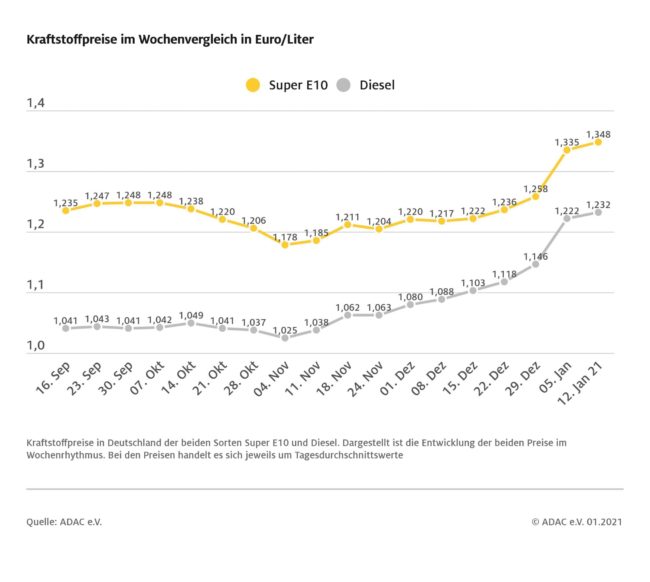 Benzinpreis klettert um 1,3 Cent, Diesel um einen Cent – Ursache ist gestiegener Ölpreis München (ots) – Nach dem kräftigen Preissprung zum Jahresbeginn ist Tanken in Deutschland binnen Wochenfrist erneut teurer geworden. Für einen Liter Super E10 müssen die Autofahrer derzeit im bundesweiten Mittel 1,348 Euro bezahlen, das sind 1,3 Cent mehr als vor einer…