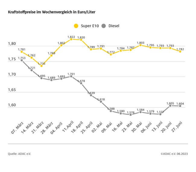 ADAC: Dieselpreis im ersten Halbjahr 2023 normalisiert – Diesel gegenüber Vorjahreszeitraum 22,1 Cent günstiger – Benzin 13 Cent billiger – Nur geringe Preisschwankungen im abgelaufenen Monat