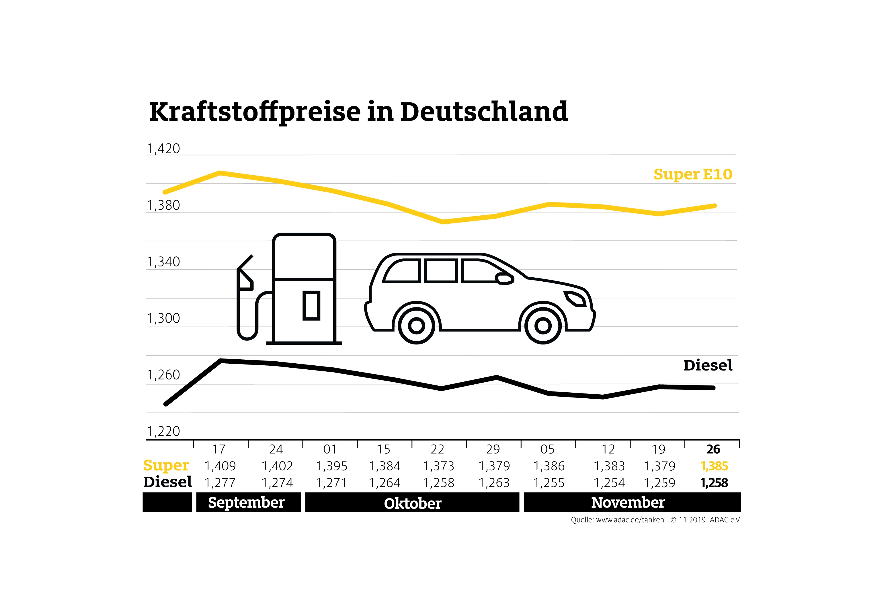 Autofahrer müssen für Benzin wieder tiefer in die Tasche greifen. Laut aktueller Auswertung des ADAC kostet derzeit ein Liter Super E10 im Bundesmittel 1,385 Euro, das sind 0,6 Cent mehr als in der Vorwoche. Diesel hingegen verbilligte sich geringfügig um 0,1 Cent auf durchschnittlich 1,258 Euro je Liter.