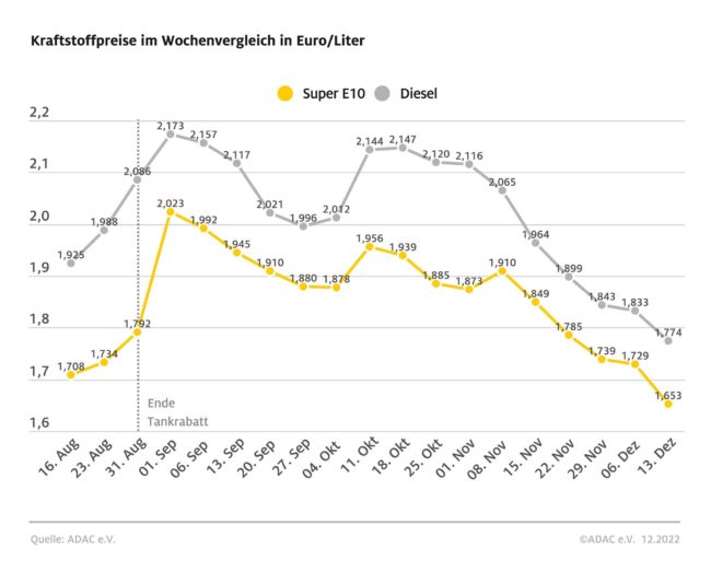 München (ots) – Eine gute Nachricht für die Autofahrer: Tanken hat sich im Vergleich zur Vorwoche weiter deutlich verbilligt – dies zeigt die aktuelle ADAC Auswertung der Kraftstoffpreise in Deutschland. Danach kostet ein Liter Super E10 im bundesweiten Schnitt 1,653 Euro, das ist ein Minus von 7,6 Cent. Ebenfalls spürbar günstiger ist Diesel-Kraftstoff: Für einen Liter…