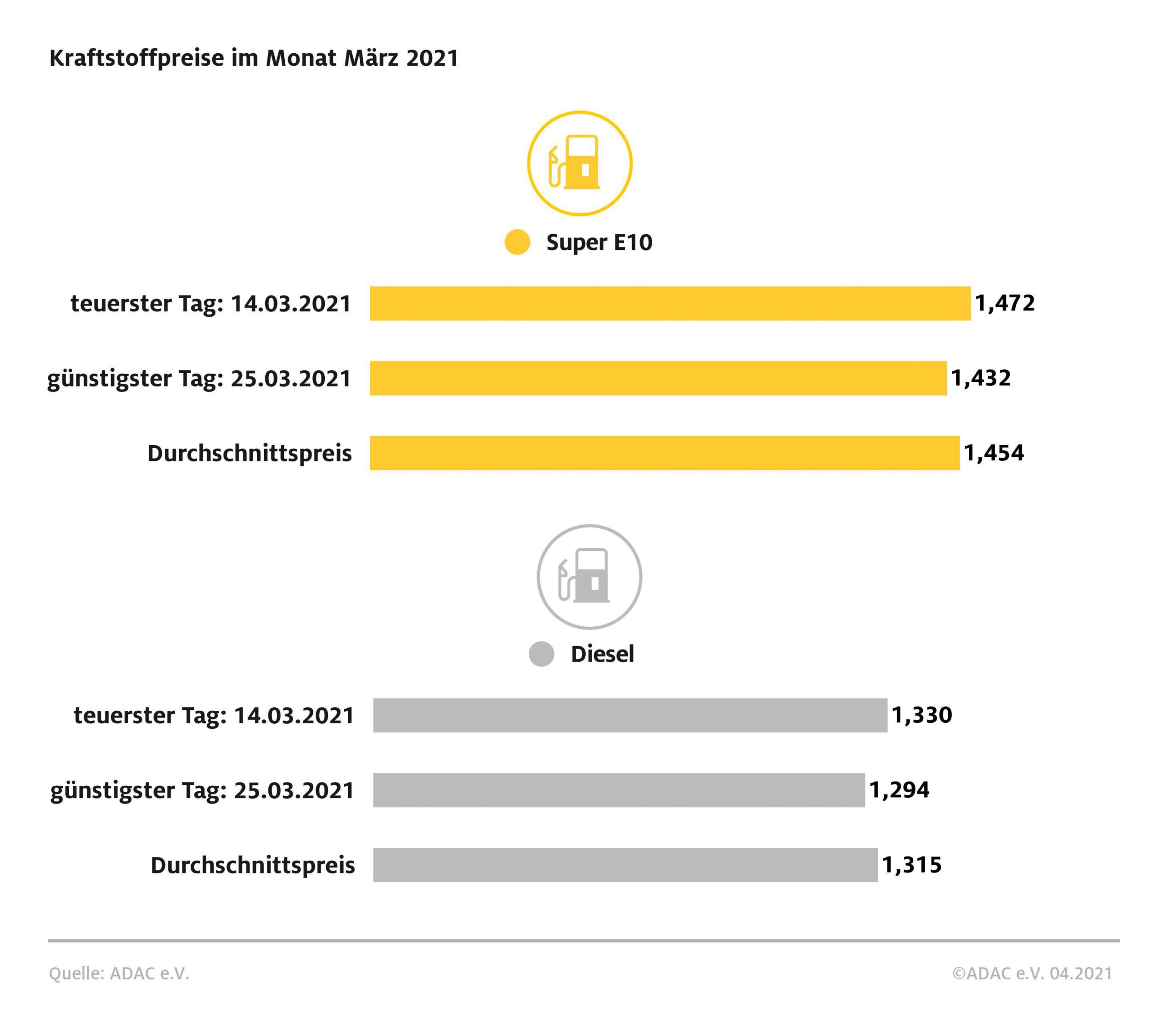 Teuerster Tag zum Tanken im März und im bisherigen Jahresverlauf war bei beiden Kraftstoffsorten der 14. März. Ein Liter Super E10 kostete damals 1,472 Euro, ein Liter Diesel 1,330 Euro. Am günstigsten konnten die Autofahrer am 25. März tanken als ein Liter E10 1,432 Euro kostete und ein Liter Diesel 1,294 Euro. Günstigster Tag des Jahres war bislang der 1. Januar. Ein Liter Super E10 kostete am Neujahrstag 1,324 Euro, ein Liter Diesel 1,215 Euro.
