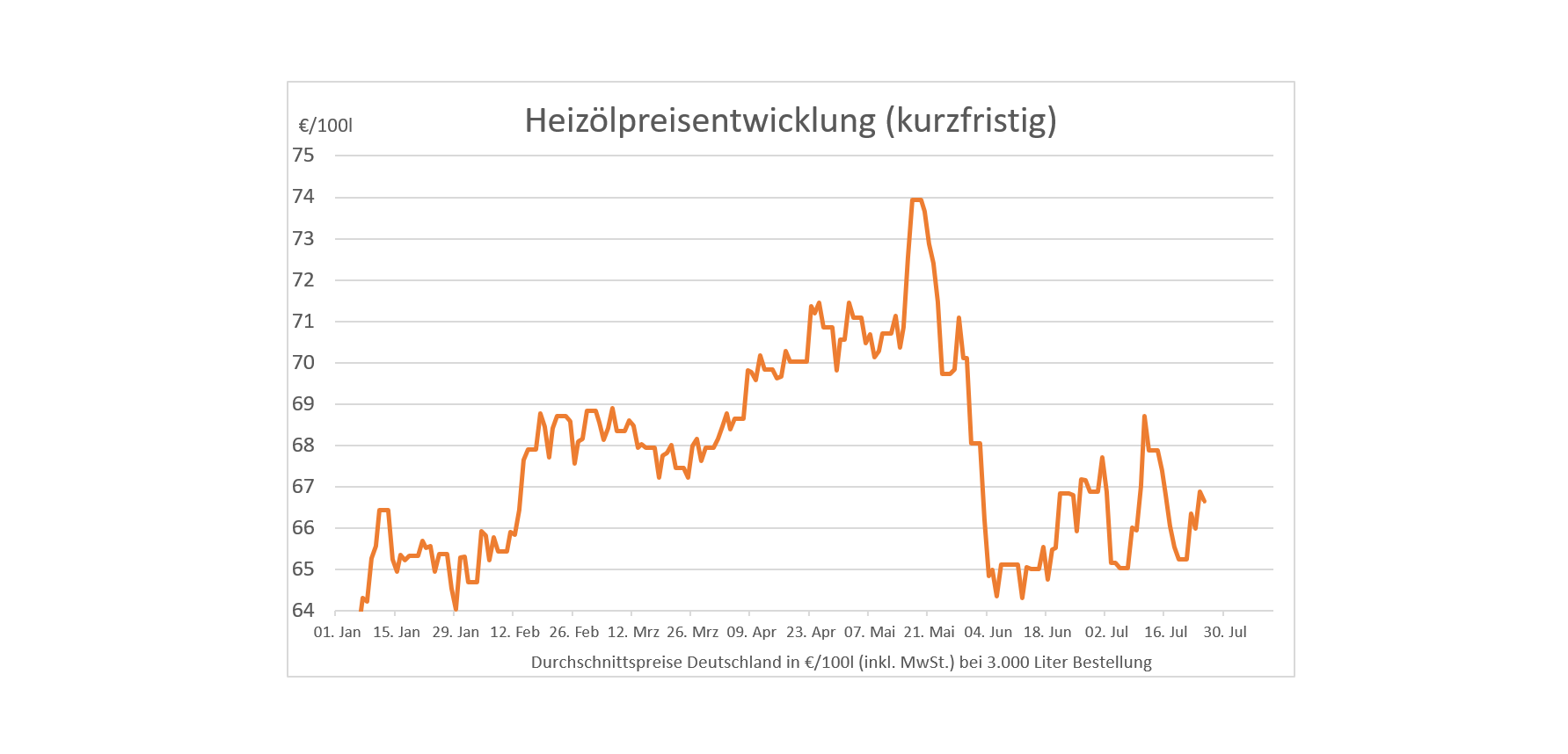 Hinweis: Die genannten Heizölpreise beziehen sich stets auf den deutschlandweiten Durchschnittspreis bei einer Bestellung von 3.000 Liter Heizöl Standard schwefelarm inklusive 19% MwSt.. Durch Transportkosten fallen die Preise regional jedoch unterschiedlich aus. Die Preisspanne zwischen den Regionen kann daher momentan bei bis zu ca. 3,33 Euro pro 100 Liter liegen. Stand der Preise: 25.07.2019