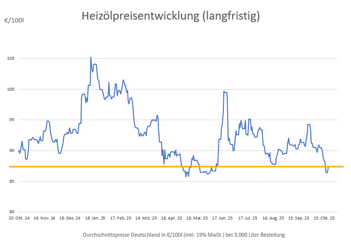 Die genannten Heizölpreise beziehen sich stets auf den deutschlandweiten Durchschnittspreis bei einer Bestellung von 3.000 Liter Heizöl Standard schwefelarm inklusive 19% MwSt. Außerdem fallen durch Transportkosten die Preise regional unterschiedlich aus. Stand der Preise 20.10.2025