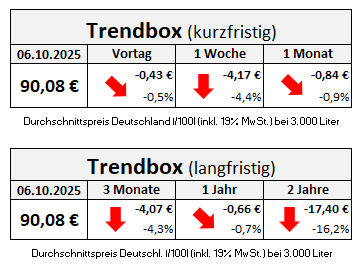 So zahlen Verbraucherinnen und Verbraucher im bundesweiten Durchschnitt etwa 0,43 Euro weniger als noch am Donnerstagvormittag. Im Vergleich zum letzten Montag wird der Preisrückgang sogar noch deutlicher, denn am 29. September lag der Durchschnittspreis mit 93,11 Euro pro 100 Liter insgesamt 4,17 Euro höher als heute. Der steile Preisanstieg aus der letzten Septemberwoche ist damit also erst einmal wieder passé und die Heizölpreise wieder auf dem Niveau von Anfang September.