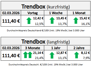 Die genannten Heizölpreise beziehen sich stets auf den deutschlandweiten Durchschnittspreis bei einer Bestellung von 3.000 Liter Heizöl Standard schwefelarm inklusive 19% MwSt. Außerdem fallen durch Transportkosten die Preise regional unterschiedlich aus. Stand der Preise 02.03.2026