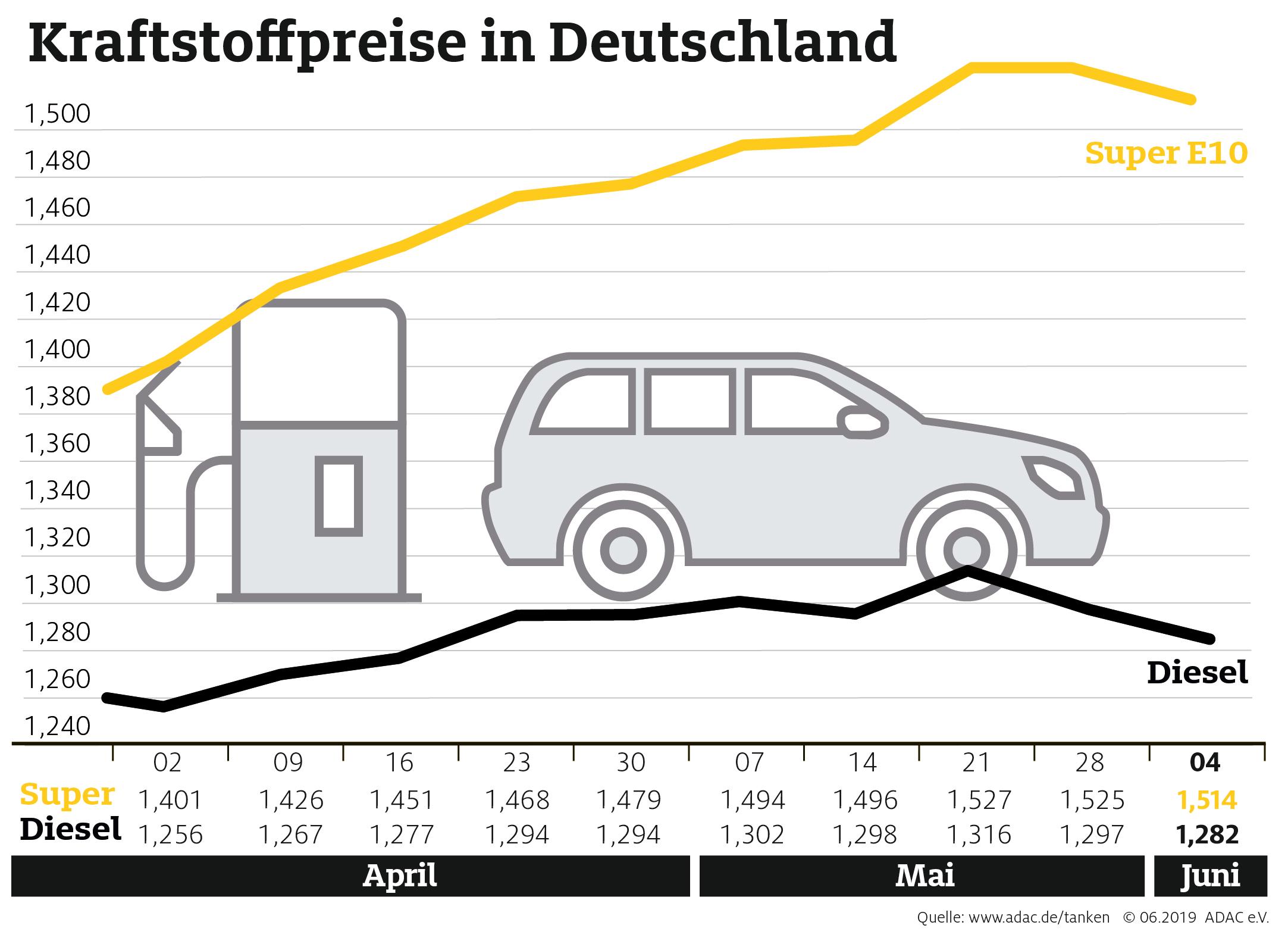 Nach den Jahreshöchstständen im Mai können Autofahrer wieder etwas preiswerter tanken. Laut aktueller Auswertung des ADAC verbilligte sich Super E10 gegenüber der Vorwoche im Bundesdurchschnitt um 1,1 Cent auf 1,514 Euro je Liter. Für einen Liter Diesel muss man im Mittel 1,282 Euro bezahlen, ein Rückgang um 1,5 Cent.