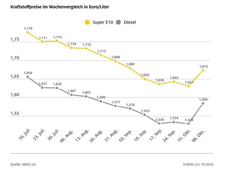 Wie die aktuelle ADAC Auswertung der Kraftstoffpreise von über 14.000 Tankstellen in Deutschland zeigt, kostet ein Liter Super E10 im bundesweiten Mittel derzeit 1,673 Euro. Das sind 4,2 Cent mehr als in der vergangenen Woche. Noch stärker hat sich Diesel verteuert: Ein Liter kostet aktuell im Schnitt 1,584 Euro – ein Plus von 5,5 Cent.