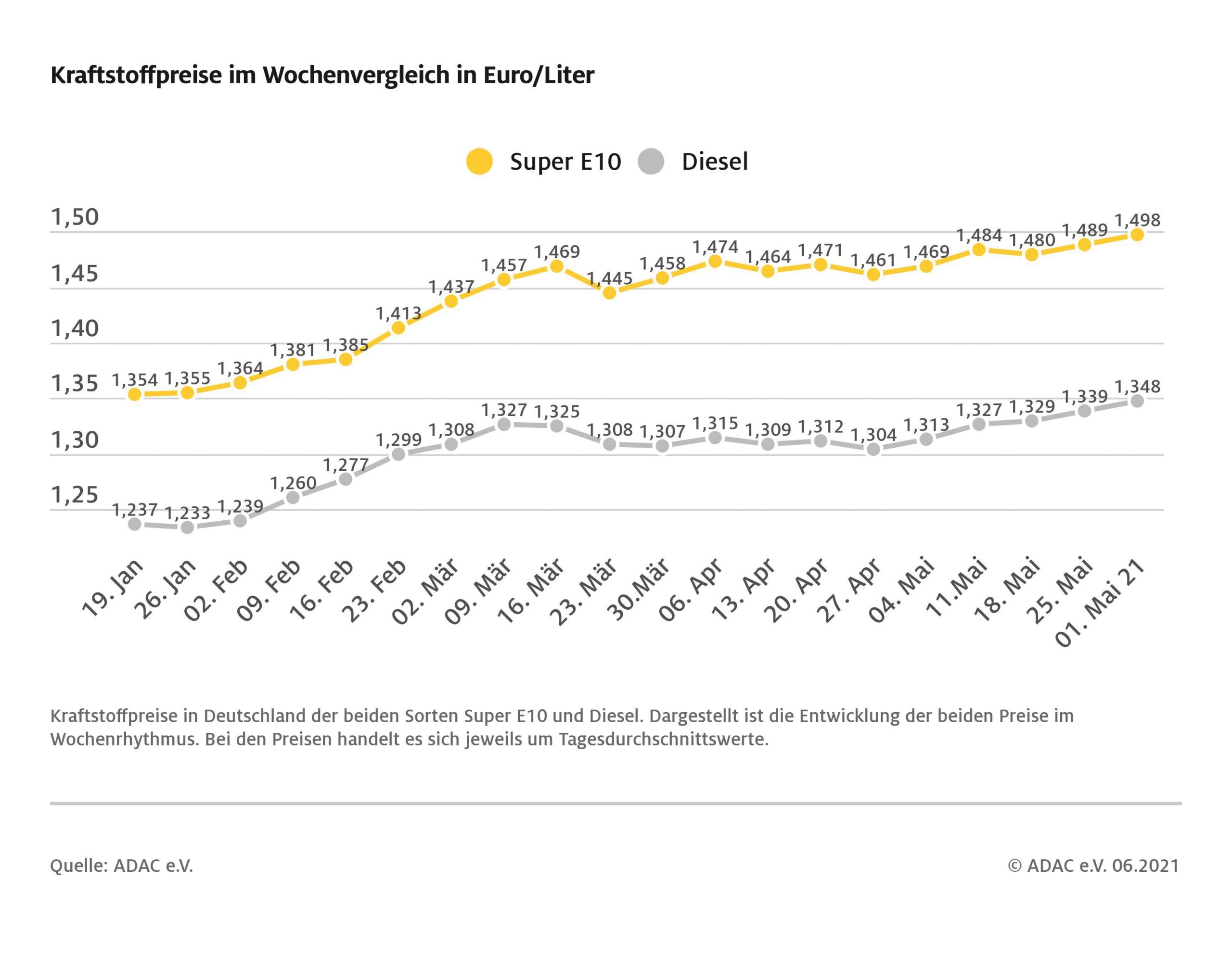 München (ots) – Der Preis für einen Liter Super E10 nähert sich immer stärker der Marke von 1,50 Euro. Dies zeigt die aktuelle ADAC Auswertung der Kraftstoffpreise in Deutschland. Danach kostet ein Liter E10 im bundesweiten Mittel 1,498 Euro – das sind 0,9 Cent mehr als in der Vorwoche. Im selben Maße hat sich auch Diesel verteuert: Der Preis für einen Liter liegt aktuell bei 1,348 Euro. Beide Kraftstoffsorten haben damit einen neuen Jahreshöchststand erreicht.
