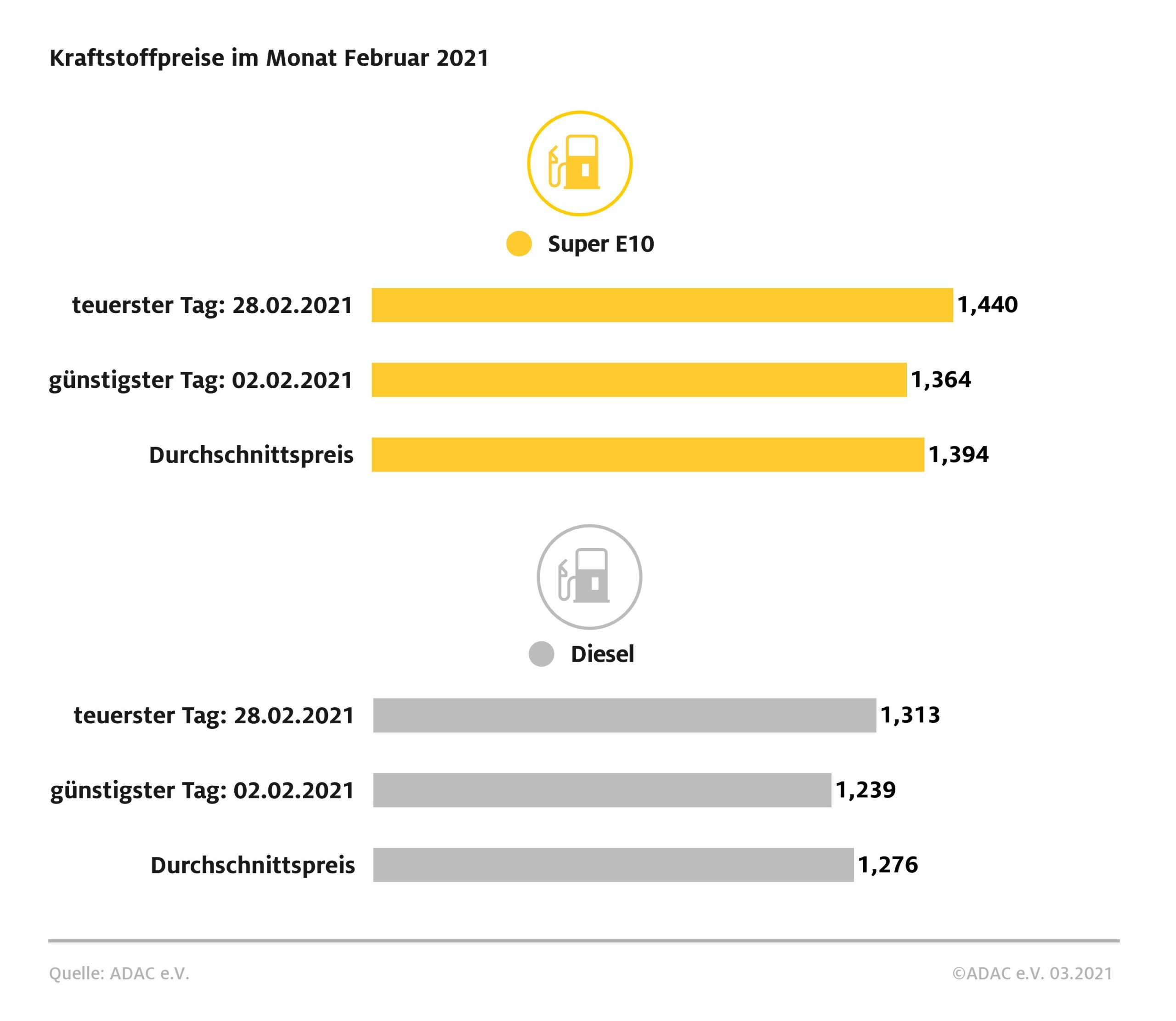 Teuerster Tag zum Tanken war für beide Sorten der 28. Februar: Am letzten Tag des Monats kostete ein Liter Super E10 im Tagesmittel 1,440 Euro. Dieselfahrer mussten 1,313 Euro je Liter bezahlen. Günstigster Tanktag war der 2. Februar mit 1,364 Euro für einen Liter E10 und 1,239 Euro für einen Liter Diesel. Seit dem Neujahrstag haben sich Super E10 bis Ende Februar bereits um 11,6 Cent und Diesel um 9,8 Cent verteuert.