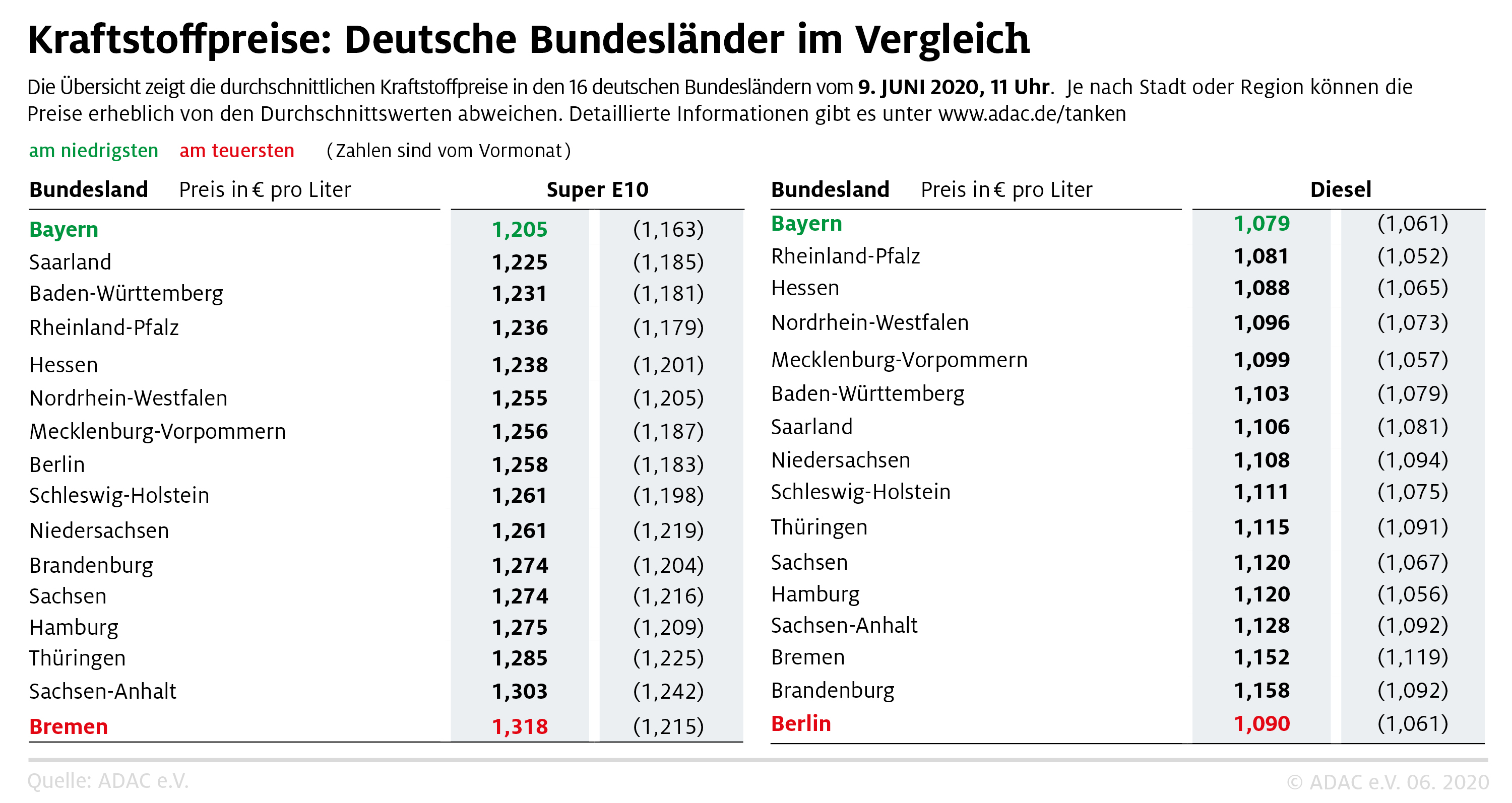 In der aktuellen Untersuchung hat der ADAC am heutigen Dienstag um 11 Uhr die Preisdaten von mehr als 14.000 bei der Markttransparenzstelle erfassten Tankstellen ausgewertet und den Bundesländern zugeordnet. Die ermittelten Preise stellen eine Momentaufnahme dar. Unkomplizierte und schnelle Hilfe für preisbewusste Autofahrer bietet die Smartphone-App „ADAC Spritpreise“. Ausführliche Informationen rund um den Kraftstoffmarkt gibt es zudem unter www.adac.de/tanken.